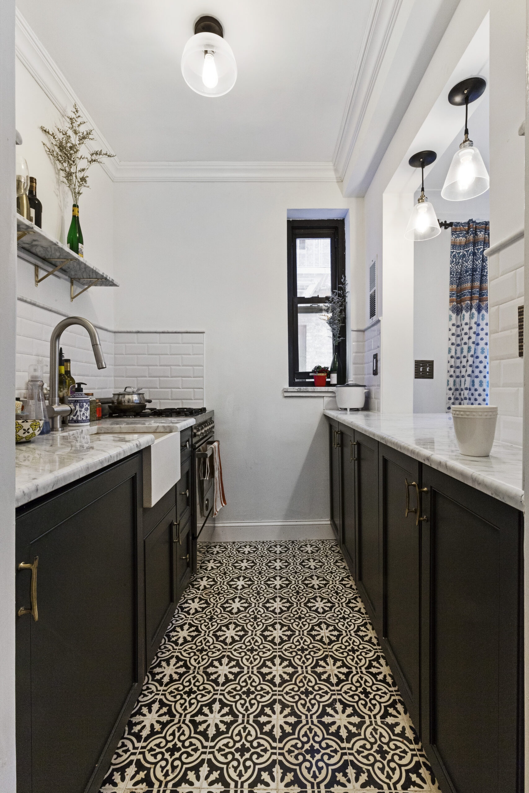 Sadly, there was no room for a dishwasher, but a 24-inch gas range fit perfectly at the end of the counter. Finishes were consistent with those found in older buildings, featuring white subway tile, marble counters, brass detailing, charcoal gray lower cabinets, and blackened metal light fixtures with a retro feel. For the floor, Emily chose a fun Spanish tile in black and white.