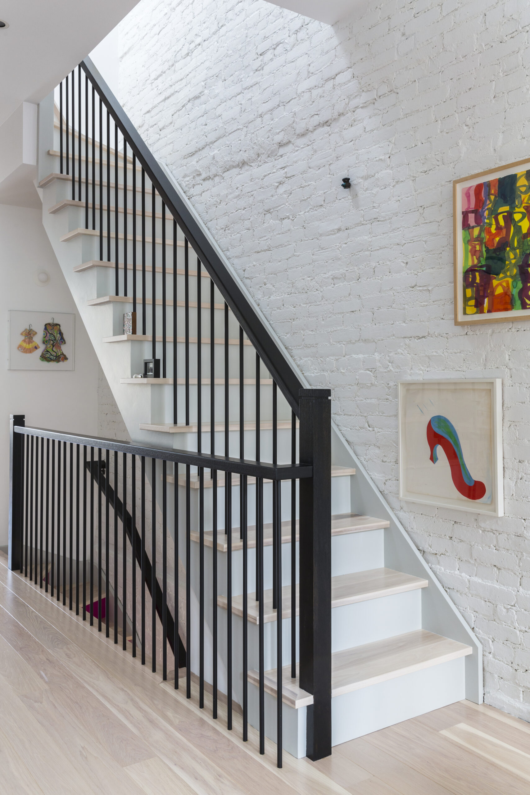 Ultimately, we closed the stairs from the ground floor to the first to create more wall space in the studio; we chose a vivid pink hue for the risers, which brightens the whole entrance. On the parlor and top floors, we went with a wood stair-rail that looks simultaneously classic and modern. In the end, we were very happy that we took our contractor’s advice.