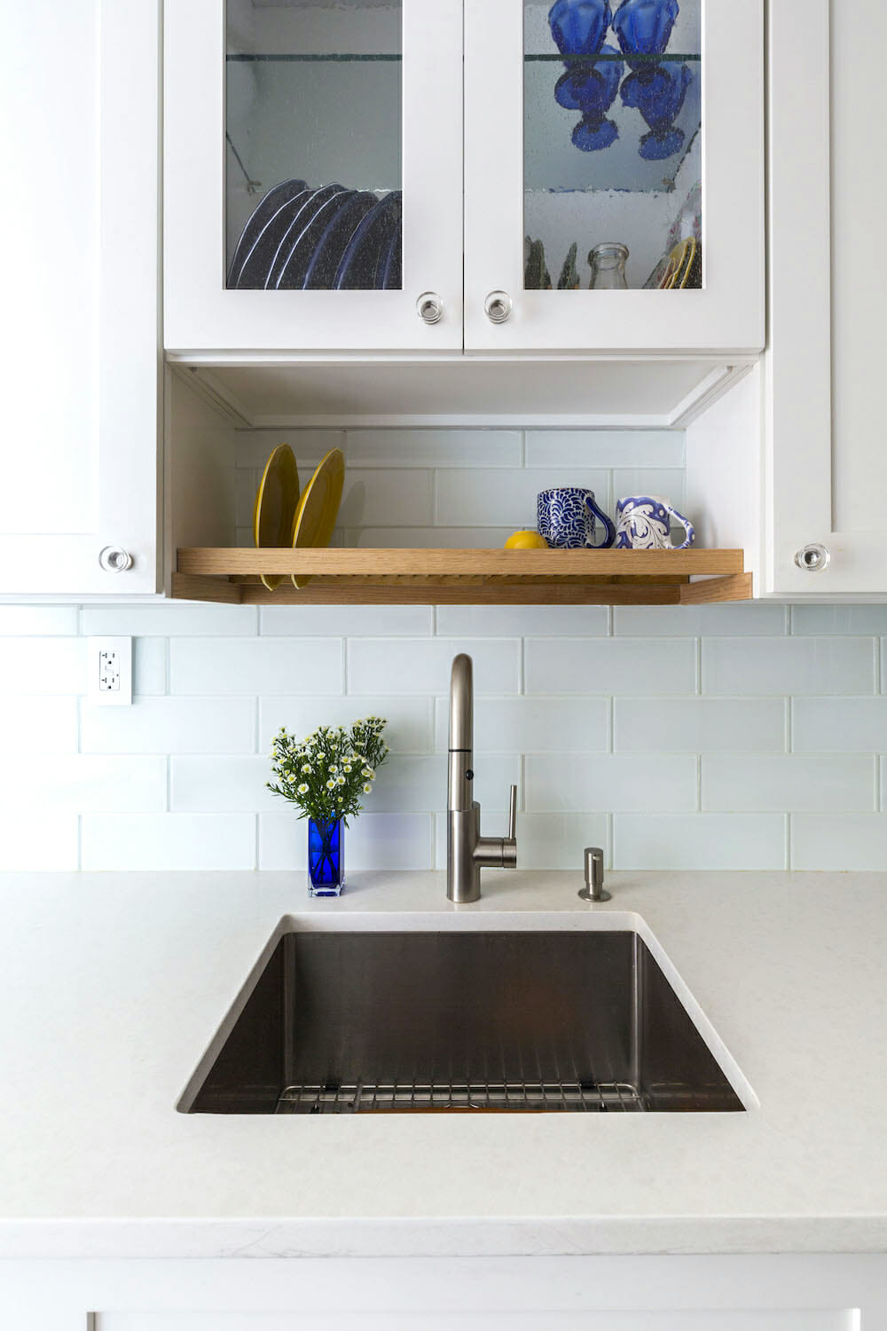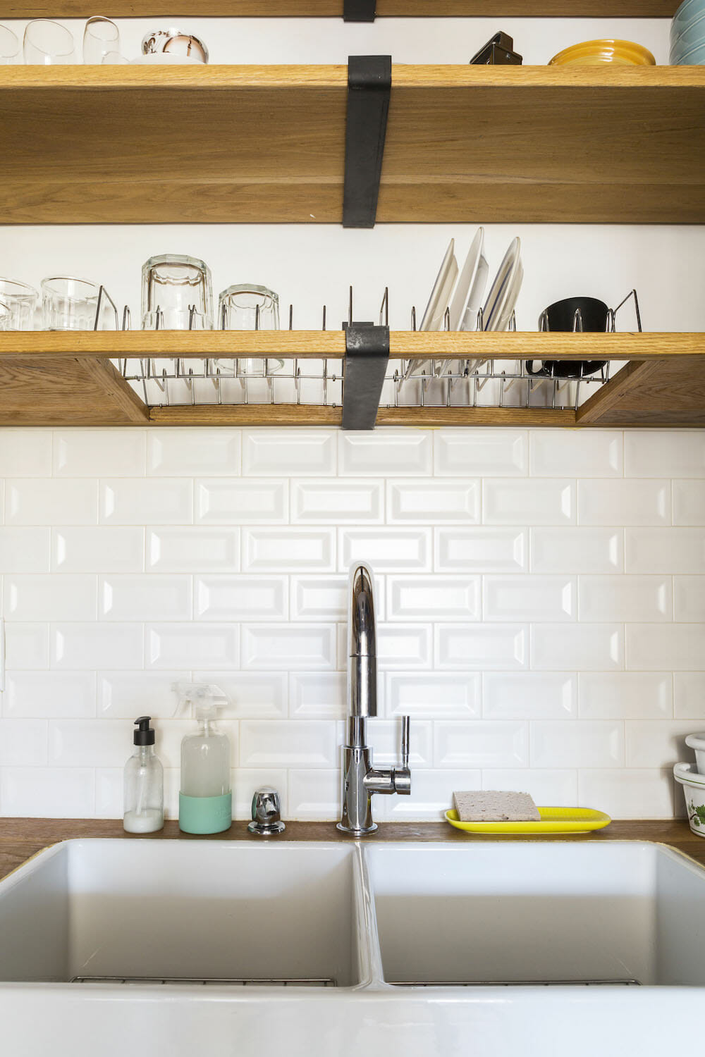 As part of Giulia’s plan for a “functional” kitchen, she knew she wanted a drying rack shelf above the sink, an idea she says she “stole” from Italy, her home country. The rack’s placement not only frees up counter space; it prevents the dreaded “puddles of standing water.”