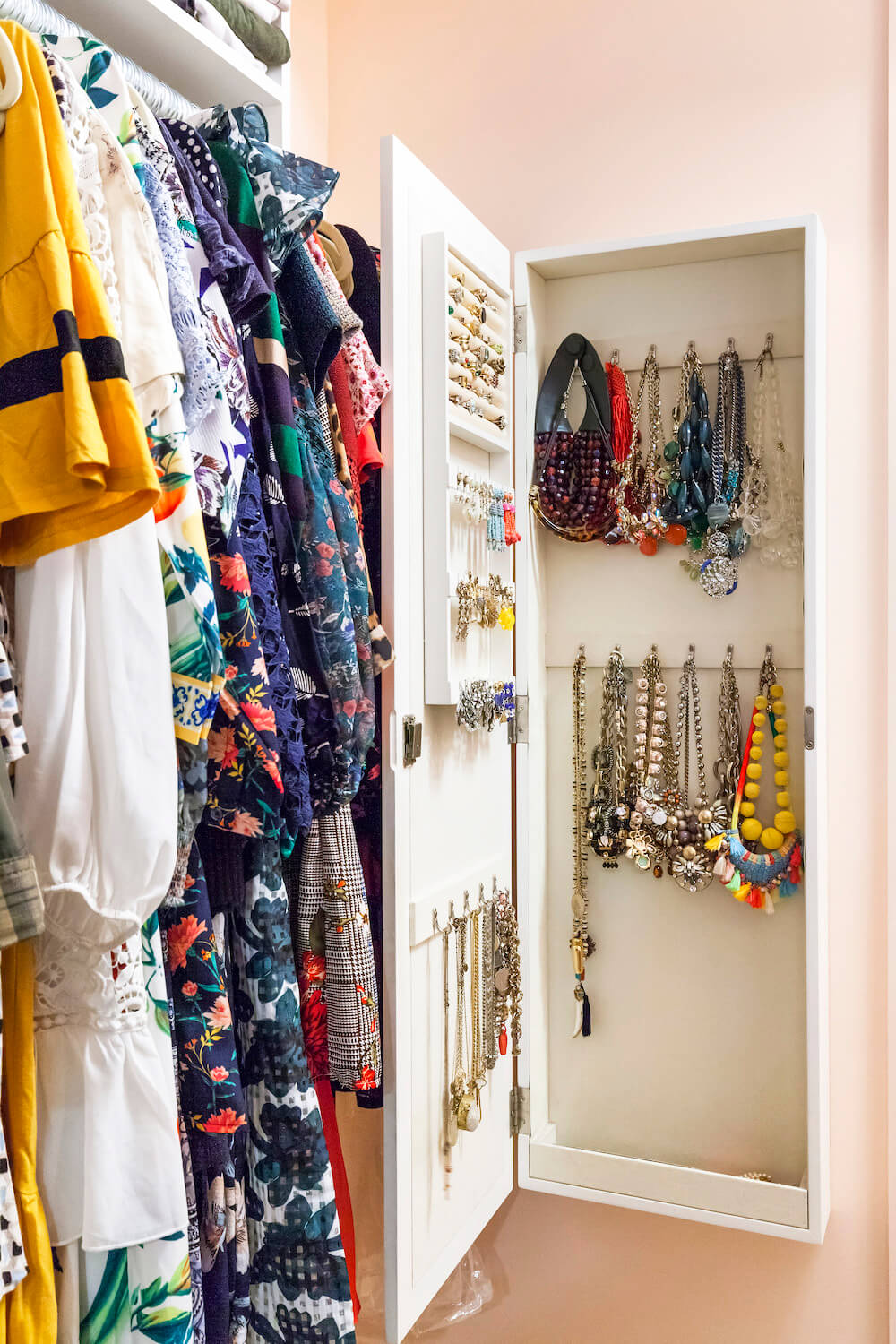(Above) Tina + Andrew’s shiny Sunnyside jewelry wall, Deanne + Daria’s closed-door accessory storage.