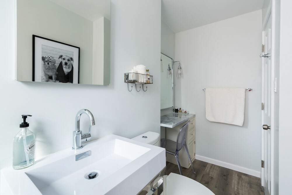 While designing their new bath space, Jessica was mindful of potential future buyers. She said, “When I bought the apartment, I found it very frustrating there were so many permanent fixtures, including a built-in glass shelf over the toilet, wall-to-wall mirrors, and tile covering most of the walls.” To give the next homeowners the room to express their own personal touch, she kept the walls painted instead of tiled, installed a mirror that could easily be replaced over the vanity table, and hung two simple towel hooks.