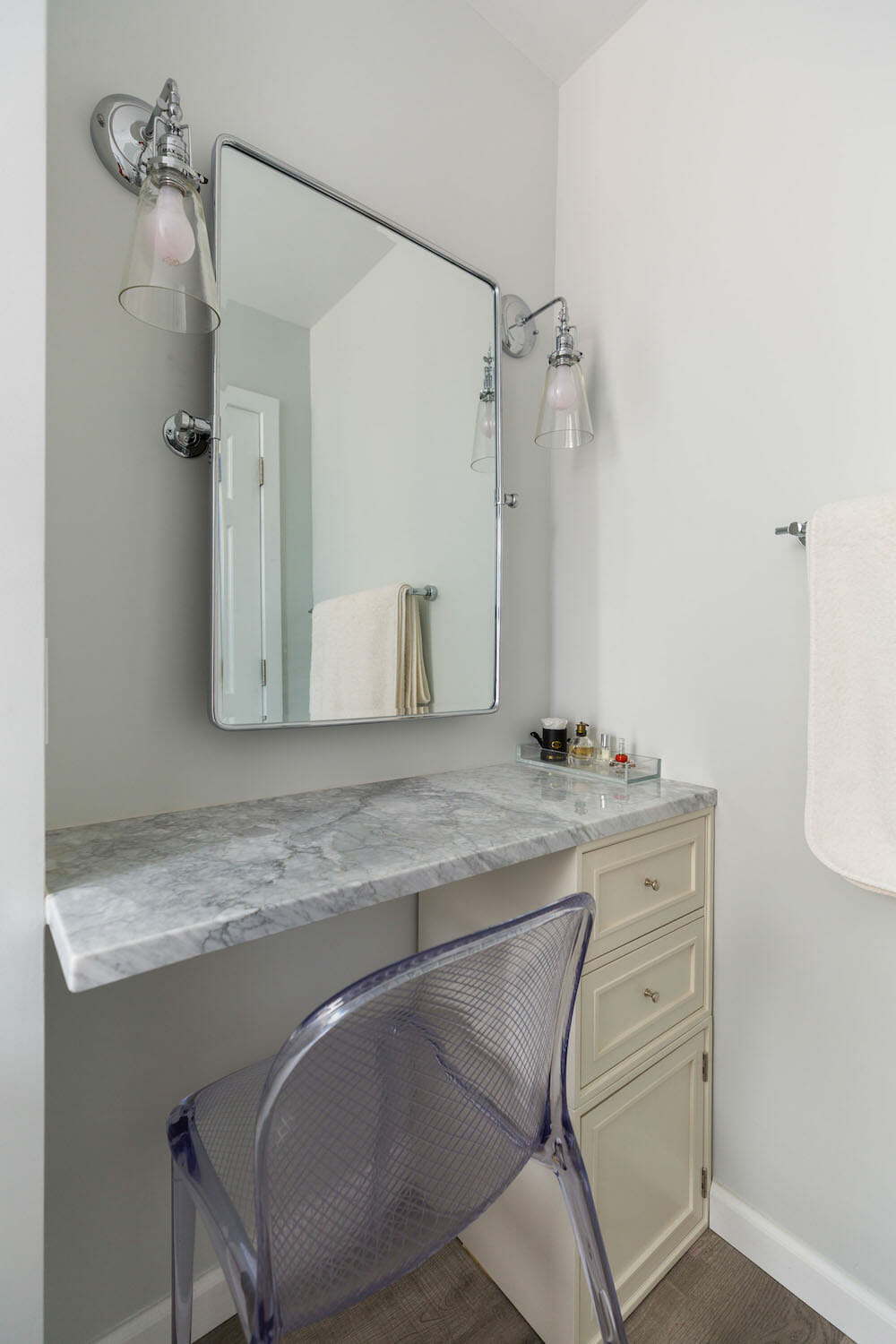 Bonus: Jessica doubled their storage by adding a two-drawer unit under the existing vanity table as well as a cabinet, creating a “personal heaven” she uses every morning to get ready for work.